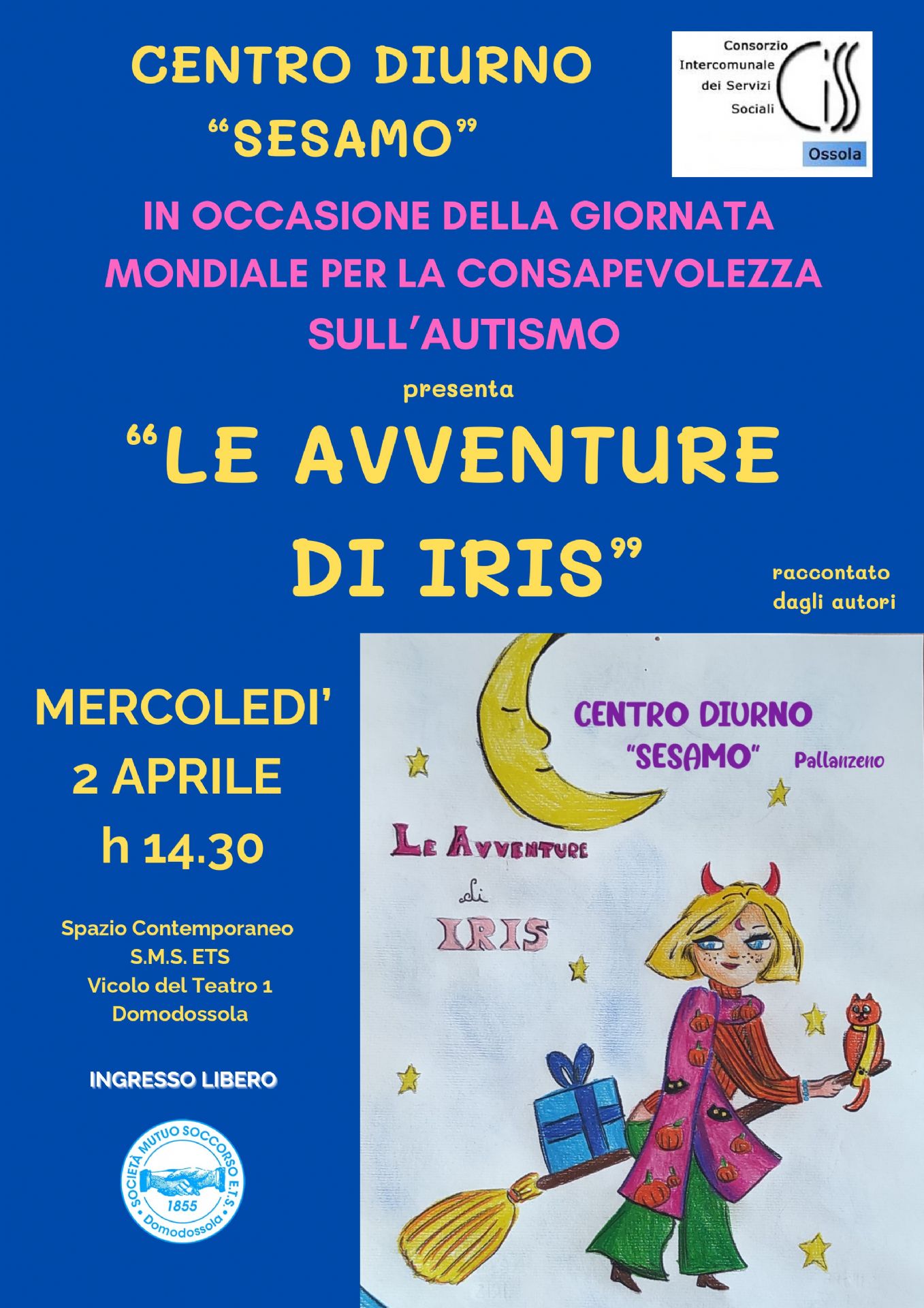 Mercoledì 2 Aprile alle ore 14.30, presso lo Spazio Contemporaneo della Società di Mutuo Soccorso – ETS in Via del Teatro 1 a Domodossola, si terrà la presentazione di “Le avventure di Iris”, primo libro realizzato interamente all’interno del Centro Diurno “Sesamo” di Pallanzeno, struttura gestita dal CISS-OSSOLA e dedicata ai disturbi dello spettro autistico.