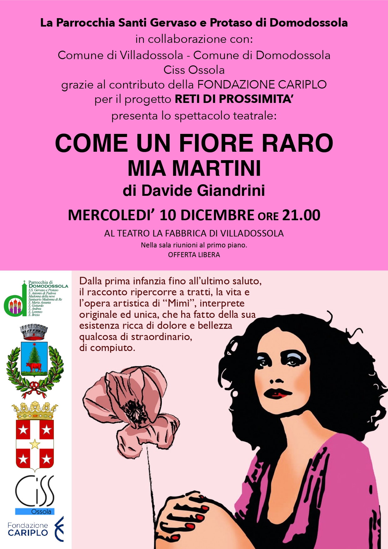 La Parrocchia Santi Gervaso e Protaso di Domodossola, in collaborazione con il Comune di Villadossola, il Comune di Domodossola e il CISS Ossola, grazie al contributo della Fondazione CARIPLO per il progetto "Reti di prossimità", presenta lo spettacolo teatrale "Come un fiore raro - Mia Martini" di Davide Gaudrini.