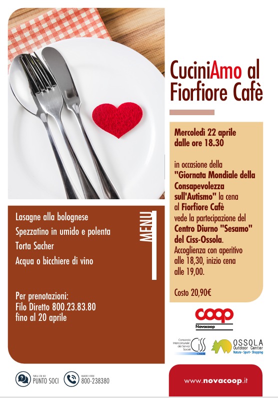 Siamo entusiasti di promuovere, in occasione della Giornata Mondiale della Consapevolezza sull’Autismo, una cena solidale molto speciale. In collaborazione con Novacoop e Ossola Outdoor Center di Crevoladossola , il Centro diurno “Sesamo” - specifico per disturbi dello spettro autistico, parteciperà in modo attivo, per regalarvi una serata in compagnia, diversa dal solito. Vi aspettiamo per celebrare insieme la consapevolezza, la solidarietà e la bellezza della diversità.