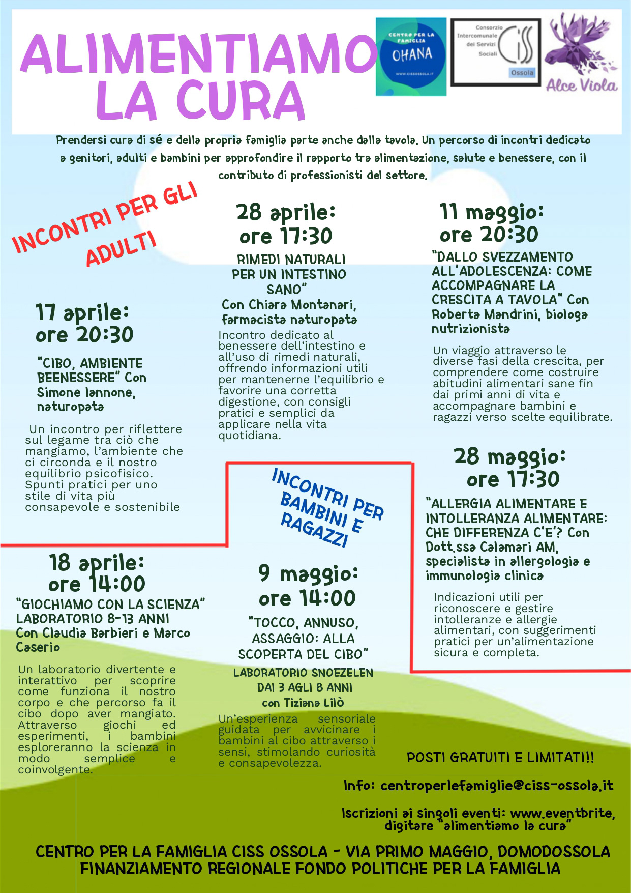 Il Centro per le Famiglie "Ohana" del CISS Ossola, nell'ambito della Promozione di politiche per il benessere familiare finanziato dalla Regione Piemonte, organizza e promuove una serie di incontri informativi dedicati al tema dell'alimentazione come strumento per prendersi cura di sè e della propria famiglia.