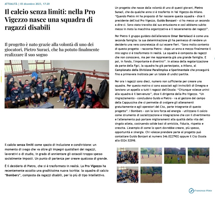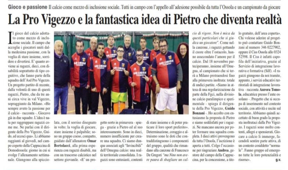 Il Sig. Pietro ha contattato in un primo momento il CISS Ossola nella persona dell’allora Direttore, il Dott. Andrea Lux, che ha appoggiato l’idea; in un secondo momento ha trovato la disponibilità di una squadra locale, la Pro Vigezzo, per avviare le procedure con la FIGC.
