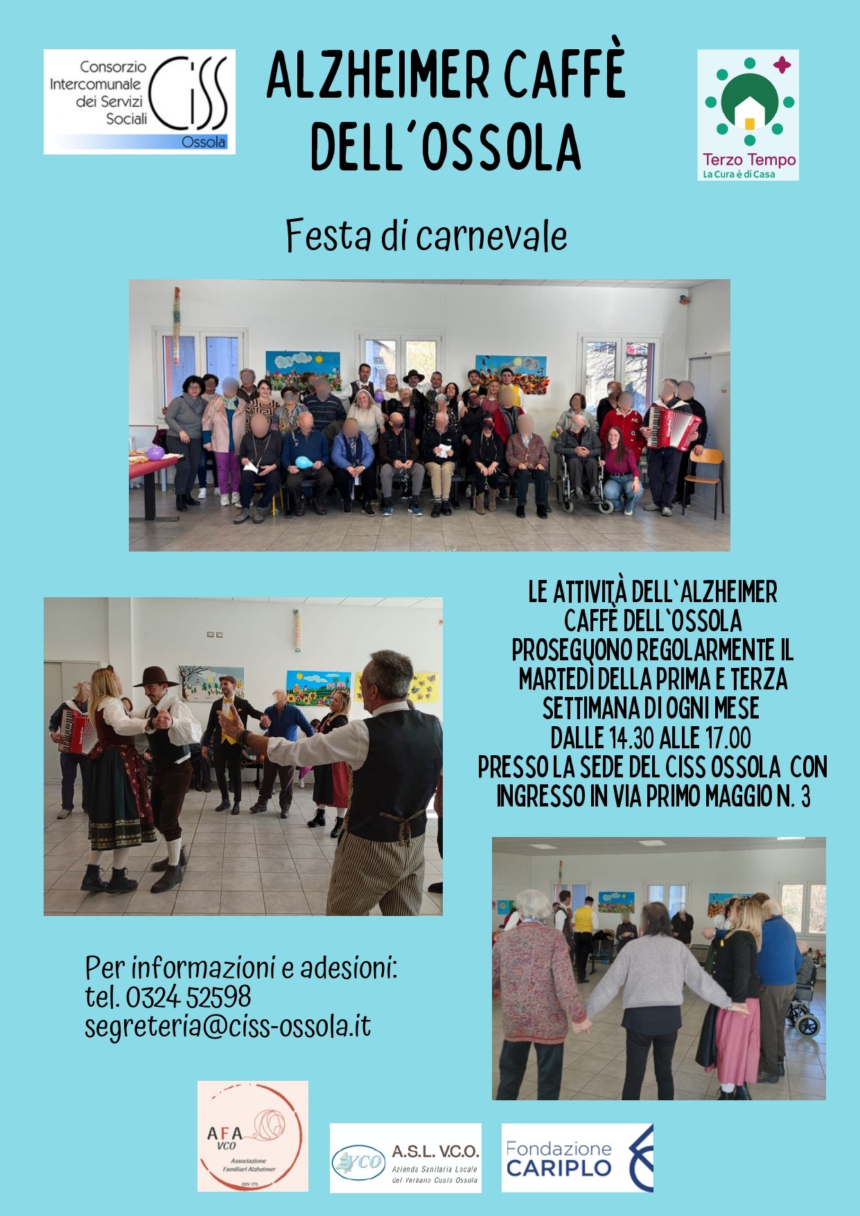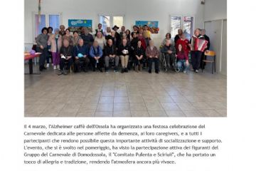 Il 4 marzo 2025 i partecipanti all'Alzheimer Caffè dell'Ossola, servizio del CISS Ossola, hanno festeggiato il Carnevale insieme ai loro caregivers, ai volontari, agli operatori del CISS Ossola e con la preziosa presenza dei figuranti del Gruppo del Carnevale di Domodossola, il Comitato "Pulenta e Sciriuii".