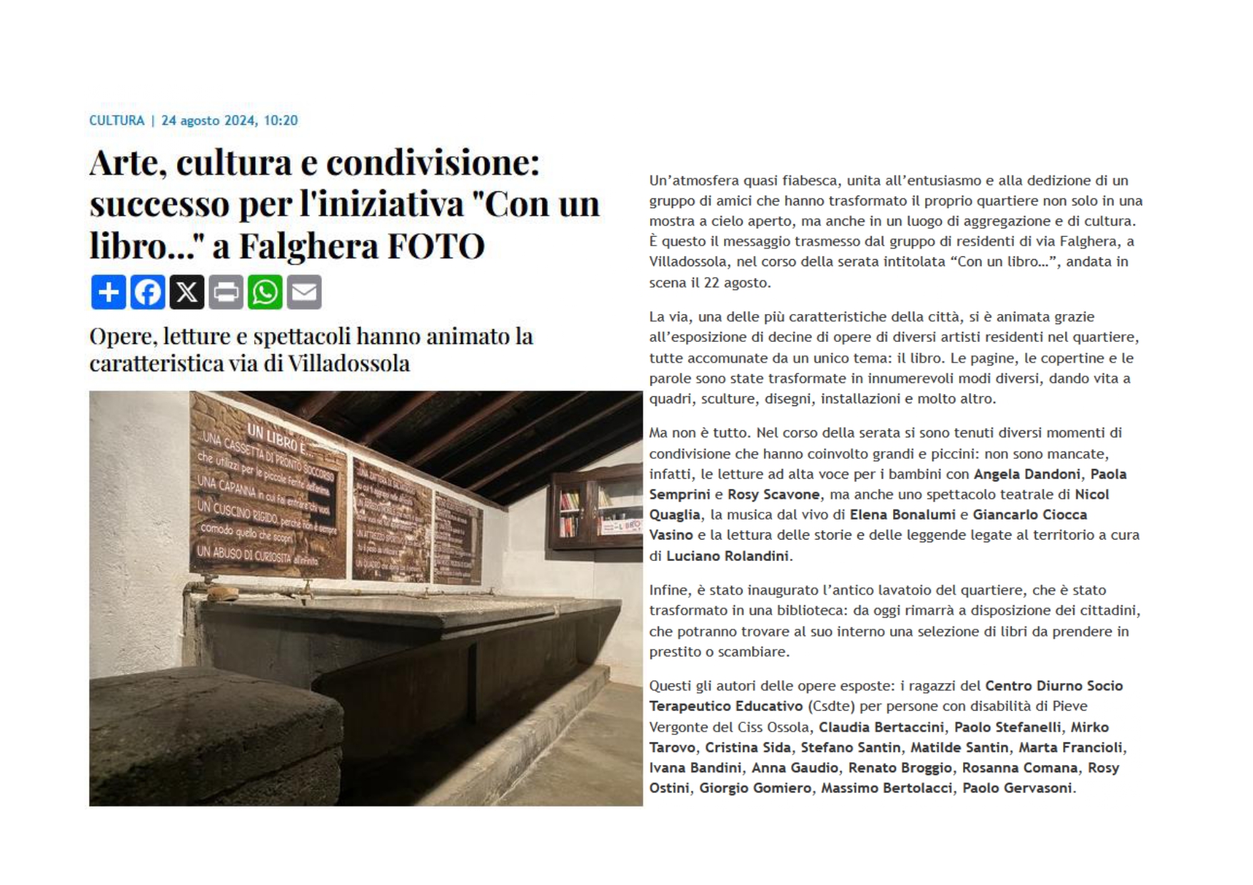 Giovedì 22 Agosto 2024 a Villadossola in via Falghera si è svolta la mostra “Con un libro…”, un progetto realizzato da un gruppo di amici del quartiere, che ha proposto un’esposizione di opere artistiche, delle performance teatrali e musicali oltre alla lettura di libri per bambini.