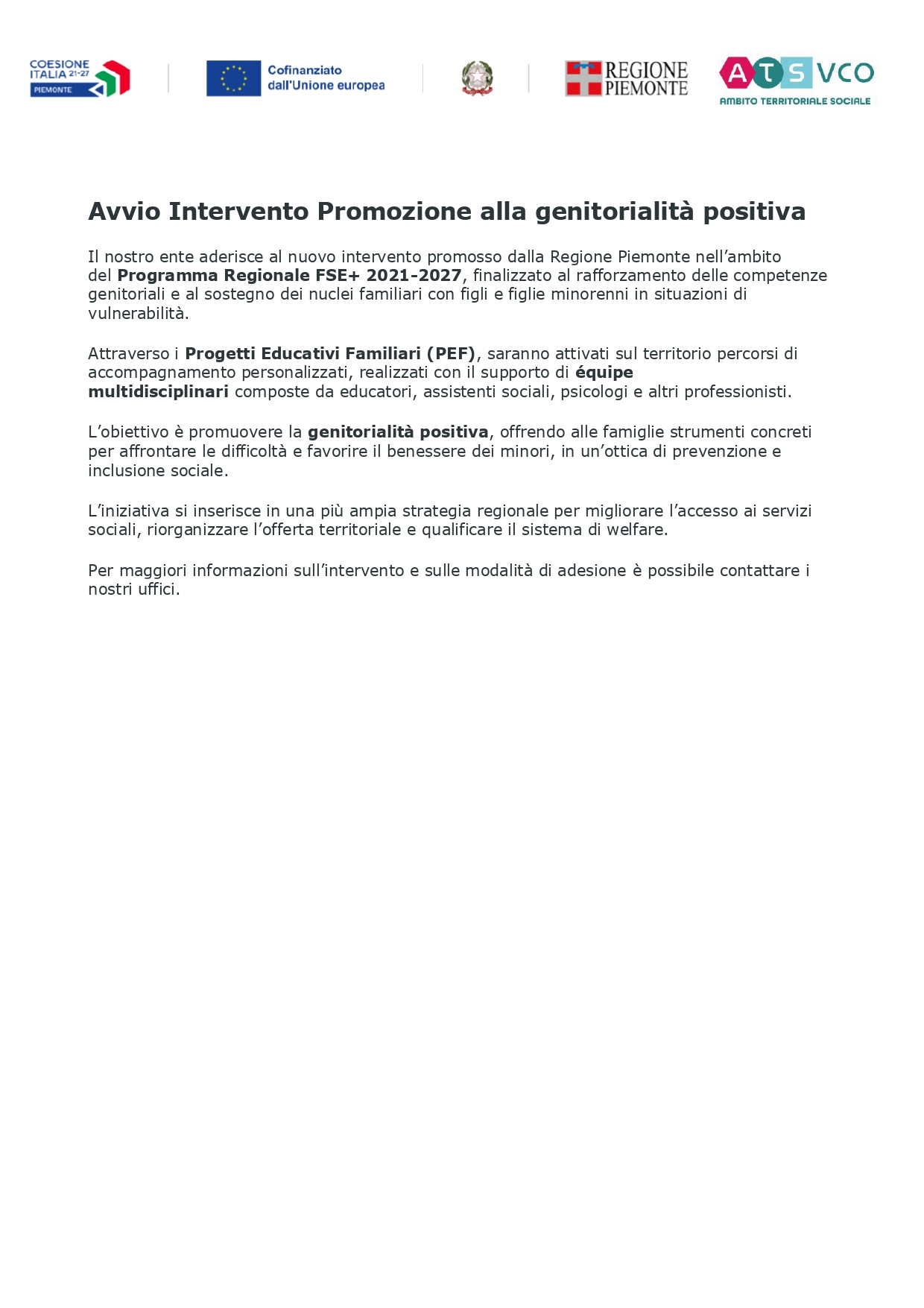 Il nostro ente aderisce al nuovo intervento promosso dalla Regione Piemonte nell’ambito del Programma Regionale FSE+ 2021-2027, finalizzato al rafforzamento delle competenze genitoriali e al sostegno dei nuclei familiari con figli e figlie minorenni in situazioni di vulnerabilità.