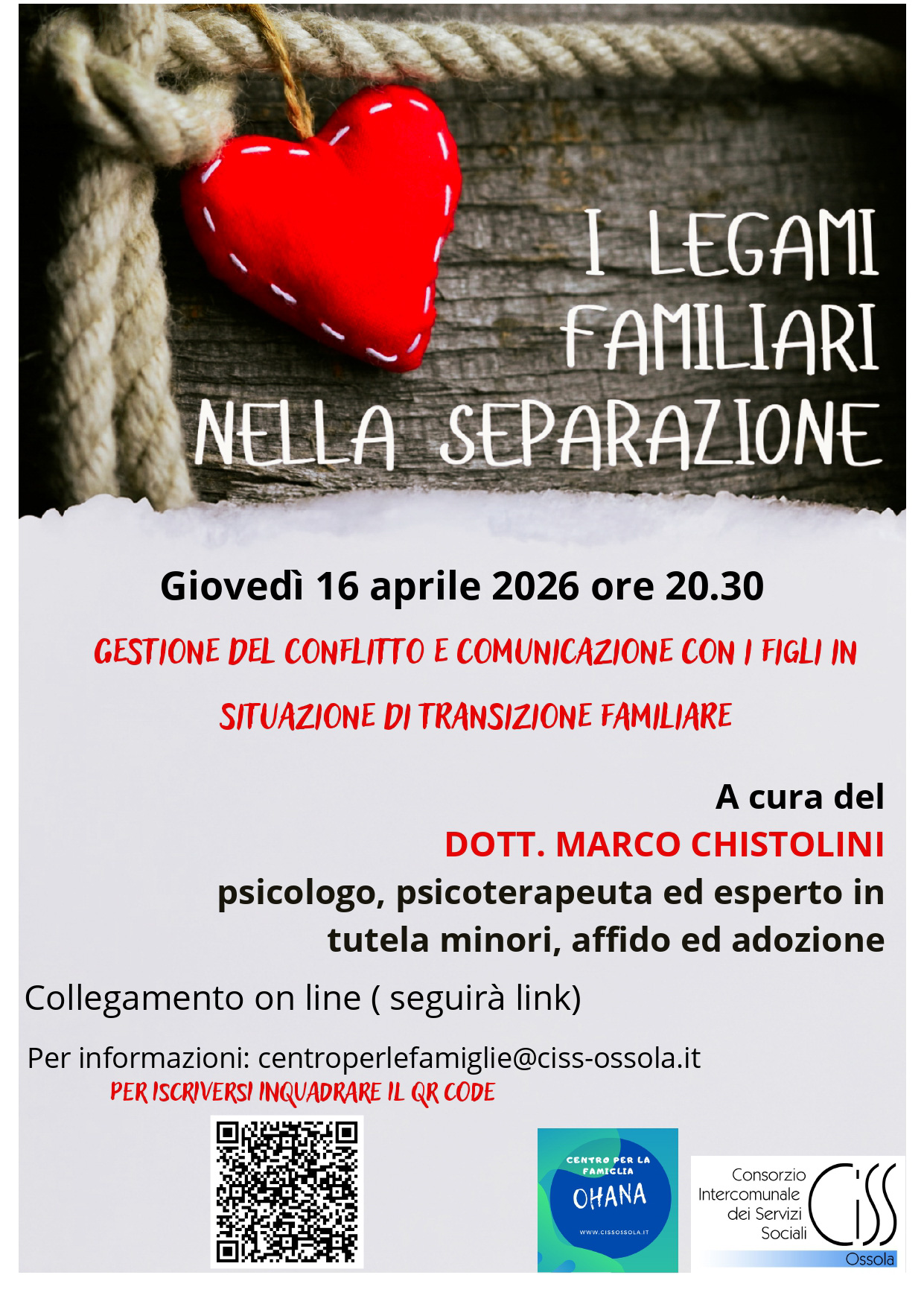 Il Centro per le Famiglie "Ohana" del CISS Ossola, nell'ambito della Promozione di politiche per il benessere familiare finanziato dalla Regione Piemonte, organizza e promuove un incontro on-line a cura del dott. Chistolini psicologo, psicoterapeuta ed esperto in tutela minori, dal titolo "I legami familiari nella separazione. Gestione del conflitto e comunicazione con i figli in situazione di transizione familiare"