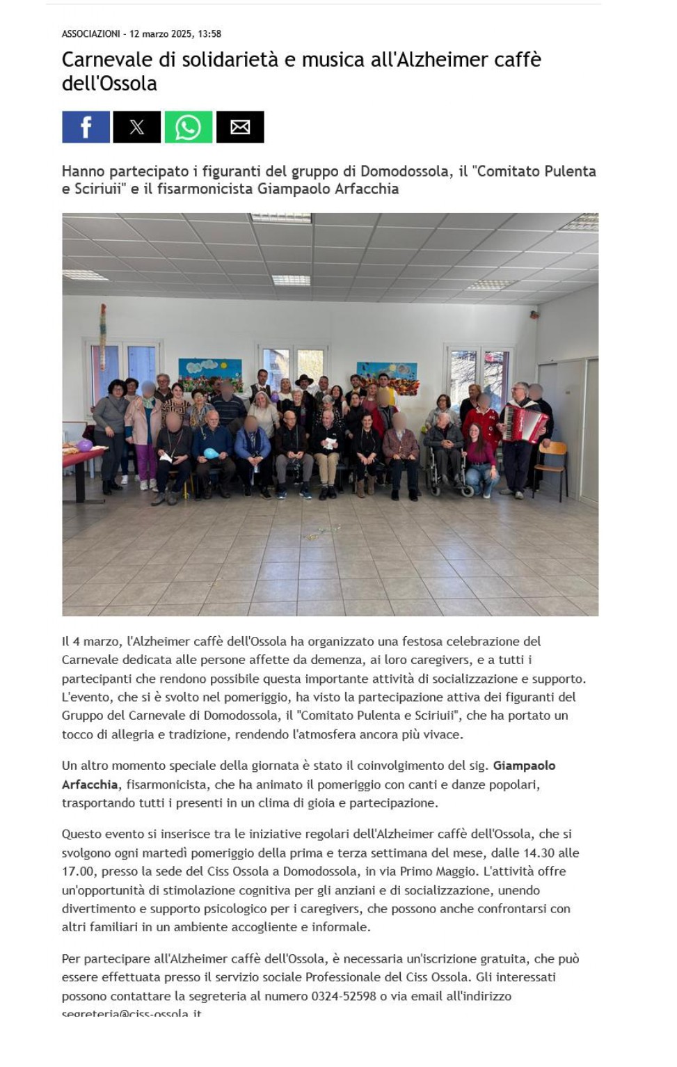 Il 4 marzo 2025 i partecipanti all'Alzheimer Caffè dell'Ossola, servizio del CISS Ossola, hanno festeggiato il Carnevale insieme ai loro caregivers, ai volontari, agli operatori del CISS Ossola e con la preziosa presenza dei figuranti del Gruppo del Carnevale di Domodossola, il Comitato "Pulenta e Sciriuii".