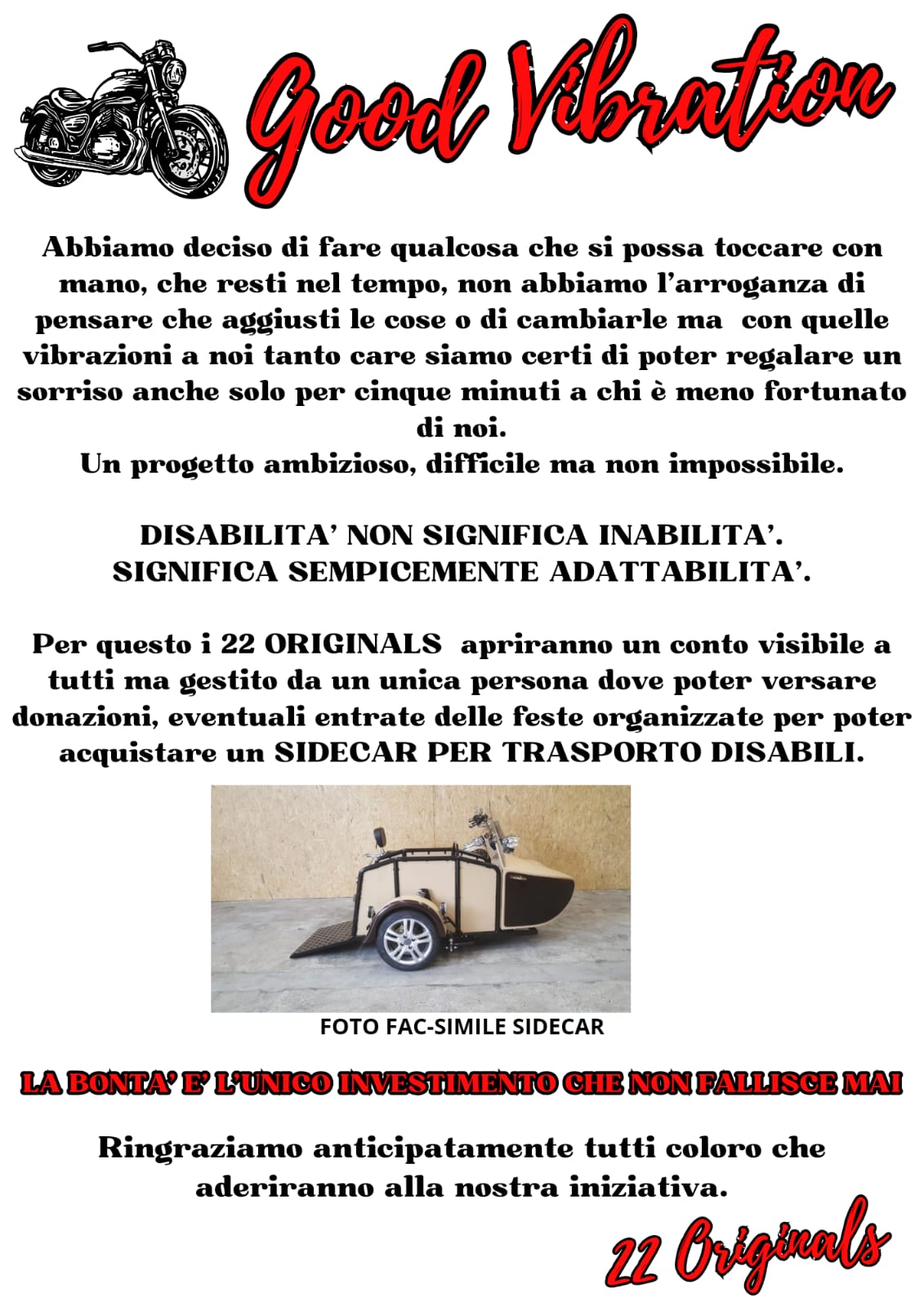 Durante i due giorni di festa è stato presentato il progetto “Good Vibration”, una raccolta fondi per l’acquisto di un sidecar per trasporto disabili, che potranno sperimentare anche gli utenti del Centro.