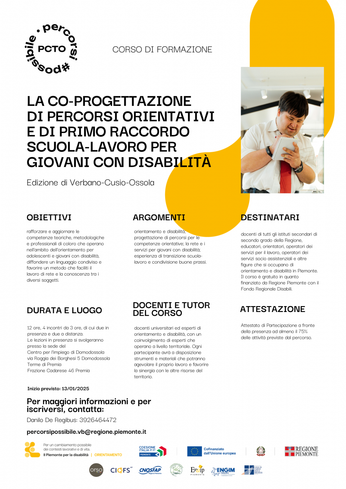 Il C.I.S.S. Ossola, con il Servizio Integrazione al Lavoro e Formazione (S.I.L.F.) e l’equipe dell’Area per le Disabilità, è uno degli attori territoriali coinvolti per la tenuta del Corso di Formazione “La Co-progettazione di percorsi orientativi e di primo raccordo scuola-lavoro per giovani con disabilità”, finanziato da Regione Piemonte con il Fondo Regionale Disabili e dedicato allo sviluppo di competenze per l’orientamento e l’inclusione delle persone con disabilità che concludono il percorso scolastico.
