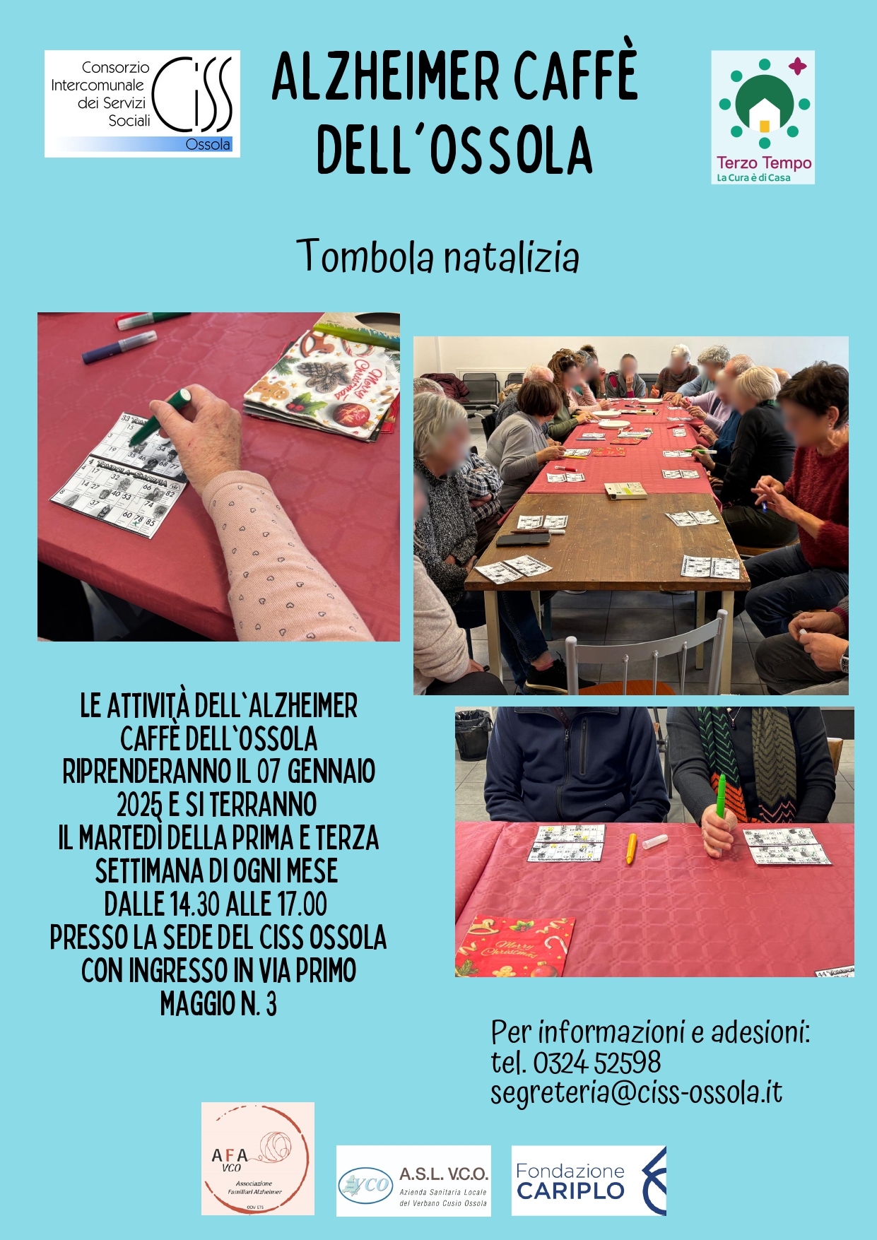 In data 17/12/2024, l’Alzheimer Caffè dell’Ossola, Servizio del CISS Ossola, ha concluso le attività dell’anno 2024 con una tombola in compagnia degli anziani affetti da demenza, dei loro caregivers, degli Operatori del CISS Ossola e con la preziosa presenza dei volontari. Il pomeriggio è stato, inoltre, rallegrato da un fisarmonicista che ha coinvolto gli anziani in danze e canti popolari del territorio.