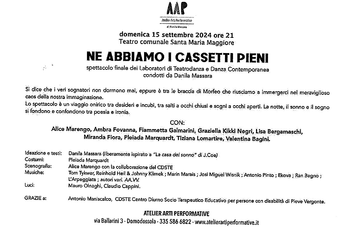 Con i manufatti abbiamo partecipato negli anni a diversi mercatini e le decorazioni di stoffa hanno abbellito eventi e feste di matrimoni. L’ultima occasione è stata presso il teatro comunale di Santa Maria Maggiore domenica 15 settembre 2024 per collaborare allo spettacolo di danza “Ne abbiamo i cassetti pieni” dell’Atelier Arti Performative di Danila Massara: la scenografia per lo spettacolo e gli abiti dei ballerini sono stati realizzati con le strisce di stoffa create dalle persone che partecipano al laboratorio presso il Centro Diurno.