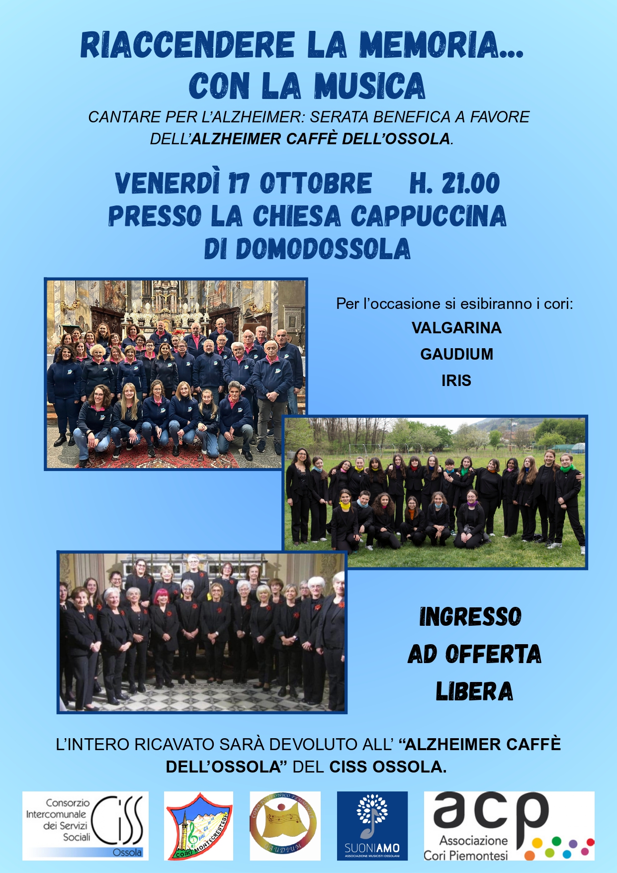 Venerdì 17 ottobre 2025, presso la Chiesa della Cappuccina di Domodossola, i Cori Valgarina,Gaudium e Iris hanno regalato al pubblico una serata di emozioni e solidarietà, unendo la bellezza del canto corale al sostegno concreto di una causa importante.